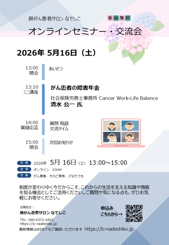 お知らせ2026.04.24肺がん患者サロン なでしこ5/16 オンラインミニ講座&交流会 ポスト シェア 送る なでしこオンラインミニ講座&交流会のご案内 日時:5月16日(土) 13:00~15:00場所:ZOOM(オンライン)講師:清水公一 氏(社会保険労務士 肺がん経験者) テーマ:がん患者の障害年金 がんと就労など 質問、困りごとを清水先生に相談してみませんか。対象:がん患者、ご家族、医療職など交流会もあります。どうぞお気軽にご参加ください!